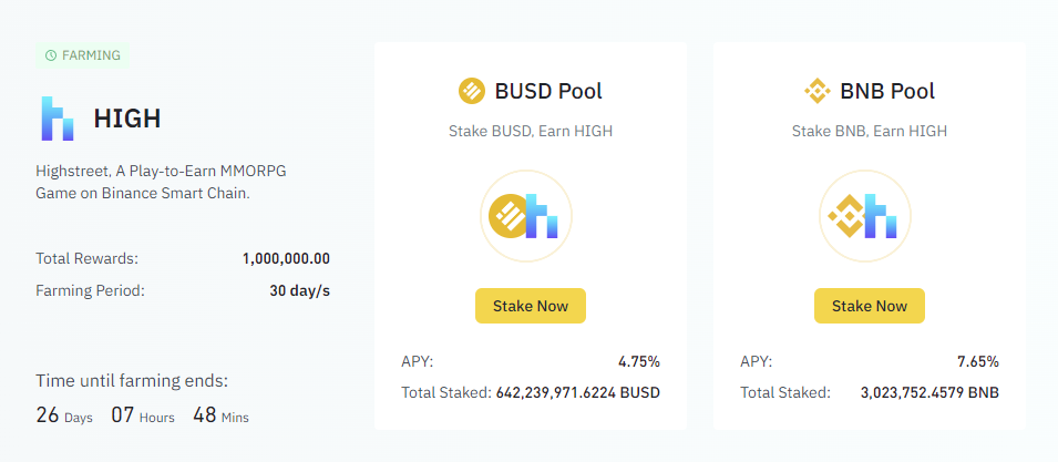 Participation in the Highstreet farming program provides Binance users with an opportunity to earn HIGH tokens by staking BNB or BUSD. The rewards are distributed to users on a daily basis and split among pool participants based on the amount of funds they’ve contributed to the particular pool.