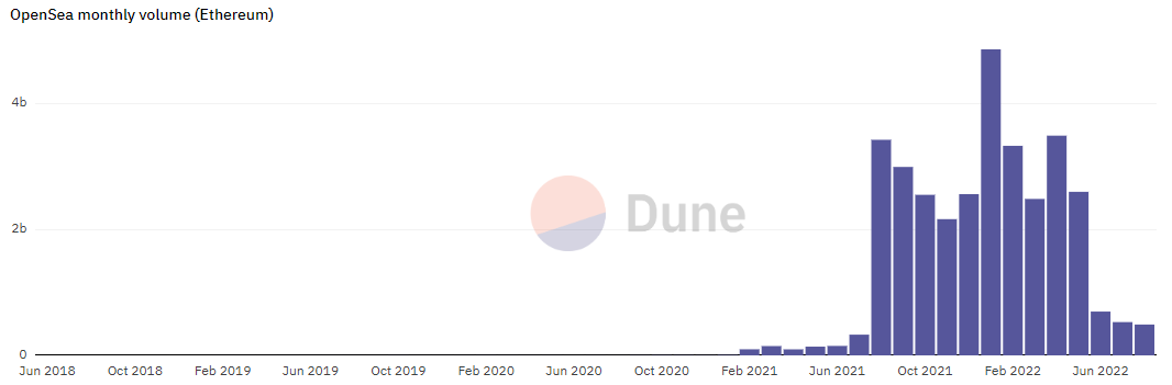 The falling NFT trading volume has led to OpenSea laying off roughly a fifth of its workforce in July. CEO Devin Finzer said that the decision to reduce the team’s size was a “difficult” one, but a necessary one to take to prepare the business for “the possibility of a prolonged bear market.” At the time, Finzer added that the company had enough capital to sustain a five-year-long crypto winter.