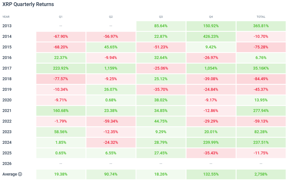The strongest year for XRP was undoubtedly 2017, where it gained over 35,000%, reaching an all-time high of $3.40 in January 2018.